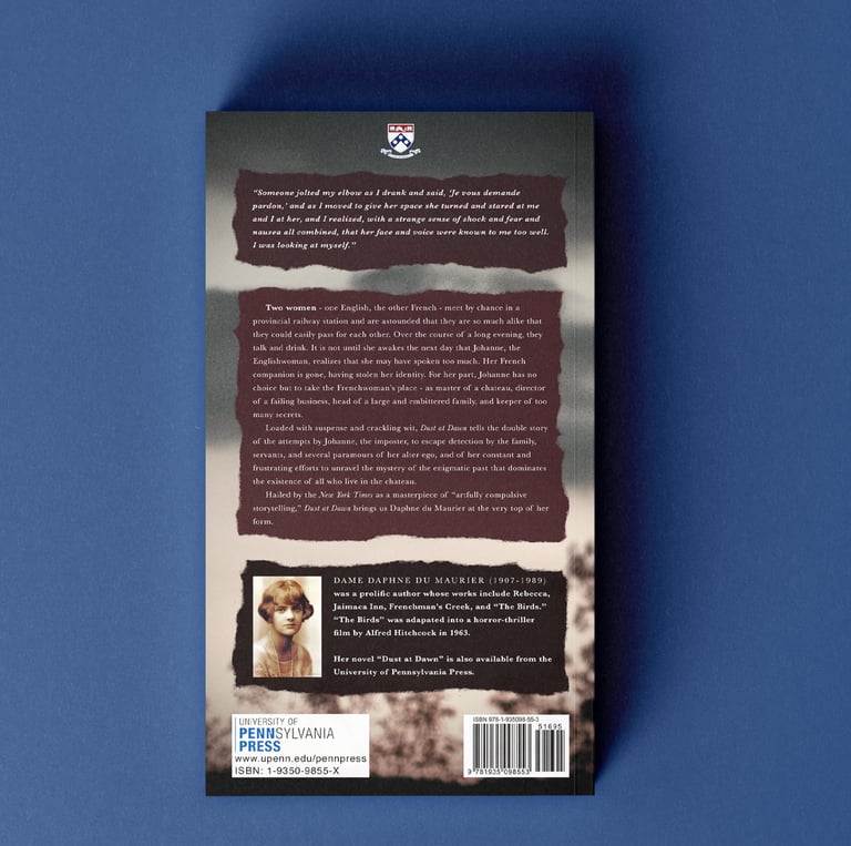 A mystery thriller novel cover design done in Adobe Photoshop. The back cover has an excerpt from Daphne du Maurier's book. She is one of the best-loved popular fiction authors of her generation.